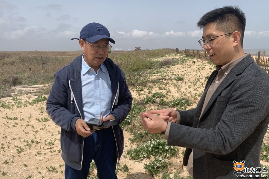王仁卿(左一)在无棣贝壳堤国家级自然保护区与学生一起考察
