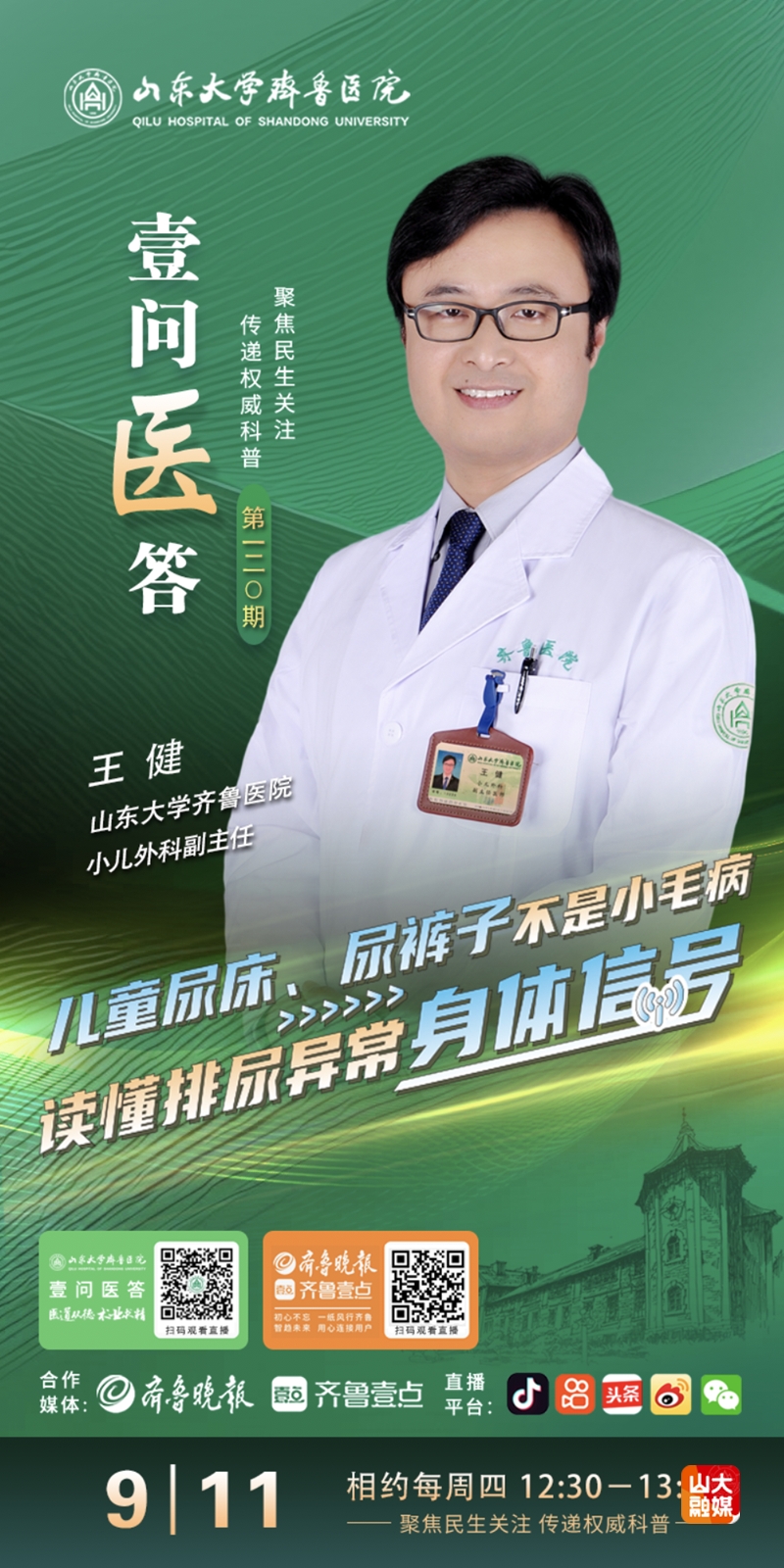 山东大学齐鲁医院小儿外科副主任王健将走进《壹问医答》直播间,讲述儿童排尿异常诊疗的相关知识。