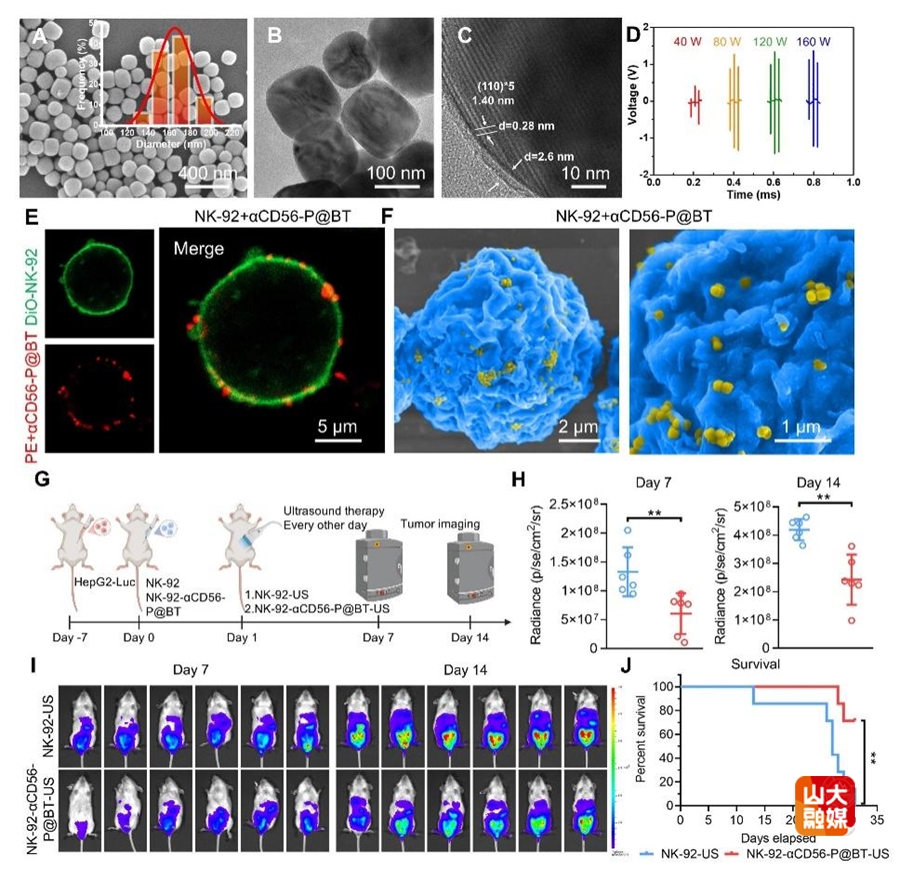 [本站讯]近日,基础医学院马春红教授/梁晓红教授团队与晶体材料全国重点实验室刘宏教授学科交叉创新团队合作开发出一种靶向结合于NK细胞表面的压电纳米材料,在超声驱动下,可在NK细胞表面产生机械力学信号与无线可控电信号,精准激活NK细胞效应功能,提高NK细胞的抗肿瘤能力,为NK细胞过继性回输治疗实体瘤治提供了创新思路。相关成果以“Ultrasound-Activated Piezoelectric Nanoparticles Targeting and Activating NK Cells for Tumor Immunotherapy”为题,发表于国际期刊Advanced Materials(中科院1区Top期刊,五年平均IF:28.9)上。文章第一作者为学科交叉创新团队博士研究生张瑞彤,通讯作者为梁晓红教授、刘宏教授,山东大学基础医学院为第一通讯单位。