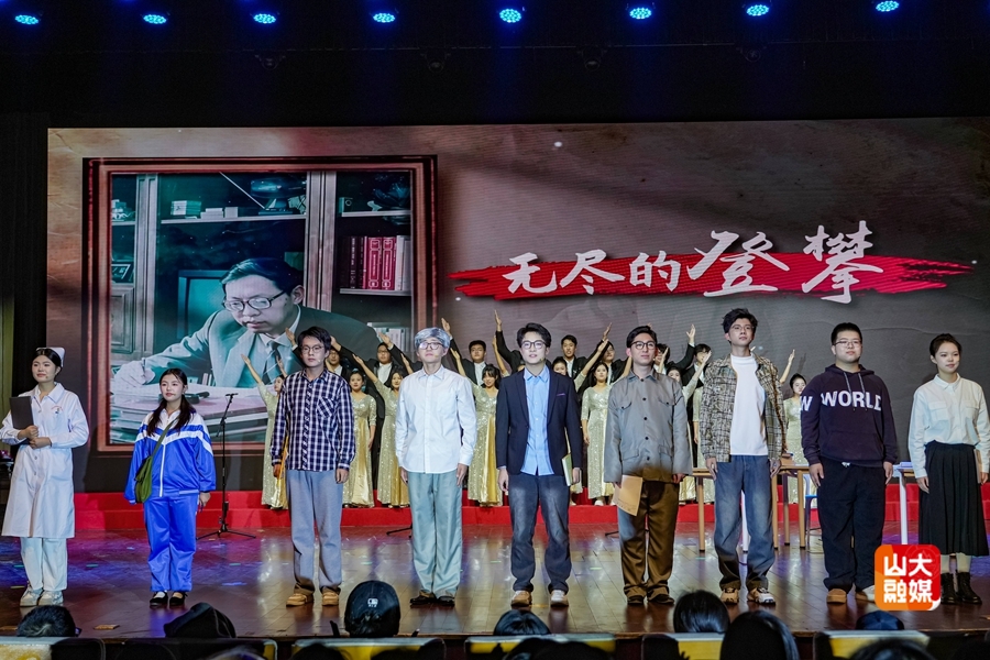 活动以大学生艺术团登攀剧社的原创情景剧《无尽的登攀——纪念潘承洞先生》拉开帷幕,通过四幕穿越时空的对话,生动呈现了潘承洞先生在不同阶段的生活与工作经历,展现了他作为党员坚定的理想信念、作为科学家孜孜不倦的探索精神、作为教育家无私奉献的博大胸怀。舜歌合唱团演唱经典曲目《追寻》,以歌声传递青春力量,致敬山大先贤,传承先辈精神。艺术学院假如戏剧工作室倾情演绎纪实戏剧《一张老照片》,以延安中央医院为背景,再现了三位齐鲁大学医学院校友——侯健存、魏一斋、金茂岳在战火中坚守医学事业,“救人、救国、救世”的感人故事,为观众还原了一段“窑洞虽简,信念如磐”的峥嵘岁月。《无尽的登攀——纪念潘承洞先生》和《一张老照片》两台剧目均入选中国科协2025年“科学家精神舞台剧推广行动”优秀剧目。