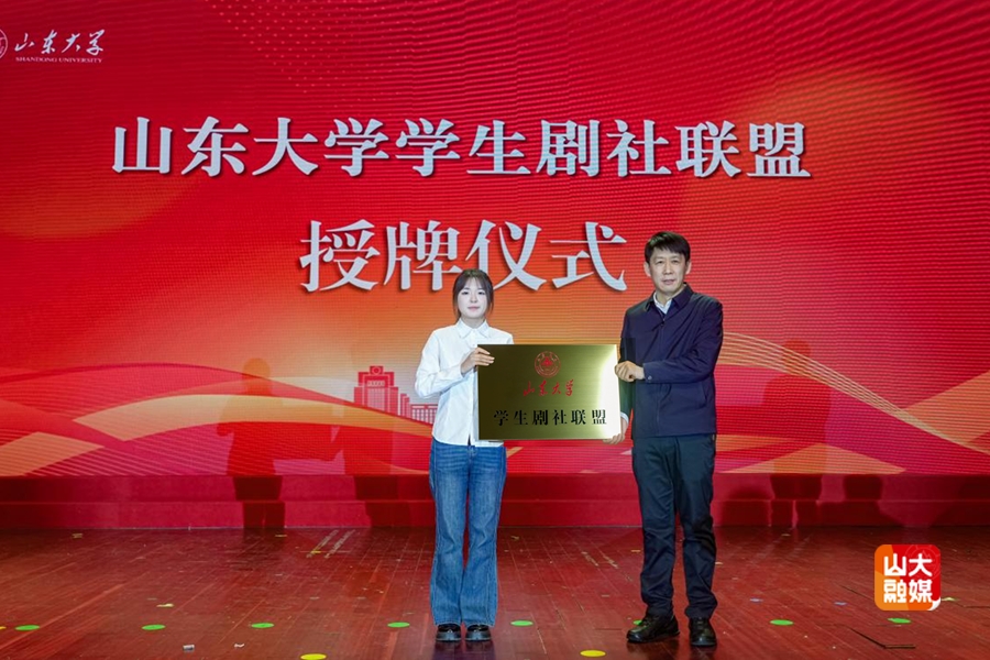 张帅为山东大学学生剧社联盟授牌并寄语。他表示,戏剧艺术既是高校美育工作的重要一环,也是青年学生涵养品格、表达思想、塑造人格的生动课堂。校园戏剧充分展现了山大学子的艺术才华与精神风貌,希望校内各戏剧类社团蓬勃发展,创作更多优秀作品,讲好山大故事,引领广大同学在戏剧中发现自己、表达自己,进一步实现“学在山大,快乐成长”。