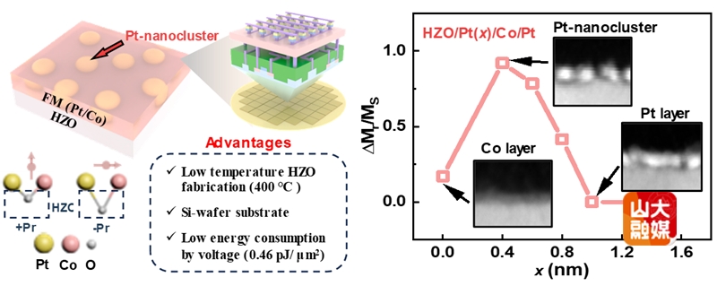 目前,传统电流驱动式自旋器件普遍面临高能耗问题,而电压驱动磁电器件虽具备超低写入能耗优势,却在CMOS工艺兼容性方面面临衬底材料与加工温度等挑战。围绕这一问题,课题组与中国科学院微电子研究所等单位联合开发出一种基于“铪基铁电-Pt/Co纳米团簇”结构的新型磁电器件。该器件通过Pt纳米团簇对Co-O 键合行为及铪基铁电层中氧迁移过程的精细调控,实现了低能耗的电压驱动磁反转。该成果为构建CMOS兼容的低功耗磁电逻辑与存储集成技术提供了重要支撑。中科院微电子所博士研究生龚帅宇、博士后李彦如,山东大学信息科学与工程学院2023级硕博连读生李晓鹏为共同第一作者;山东大学信息学院研究员武继璇,中科院微电子所副研究员杨美音、研究员罗军为共同通讯作者。