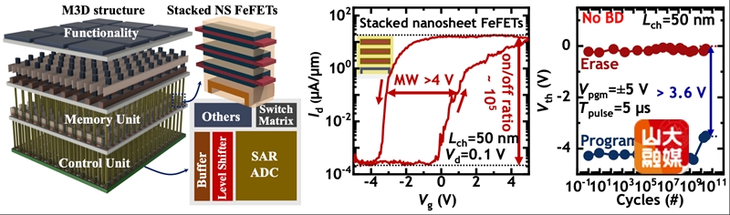针对目前氧化物半导体沟道FeFET面临的擦除能力弱、存储窗口不足以及单层沟道结构难以满足结构缩放等瓶颈,课题组与新加坡国立大学龚萧教授团队从“三维堆叠FeFET 架构创新”角度切入,首次提出并制备了后段工艺兼容的三层堆叠纳米片3D FeFET架构。该工作通过将三层氧化物半导体沟道与铁电介质薄膜集成,构建了MFMIS(金属-铁电-金属-介质层-半导体)三维结构,解决了传统氧化物半导体沟道FeFET 擦除能力弱与存储窗口不足的问题,在HZO薄膜上实现了超过4 V的超大存储窗口。同时,多层堆叠结构使沟道面积较平面器件减少超过80%,并在50 nm超短沟道器件中仍保持电学特性稳定,器件耐久性超过 3×1010次,展现出优异的可靠性与可缩放性。该研究突破了 BEOL FeFET 架构在密度、能效和工艺兼容性方面的限制,为实现大规模、低功耗、高能效的单片3D集成存储与计算系统提供了新的技术路径。冯扬、王啸林为共同第一作者,陈杰智教授、龚萧教授为共同通讯作者。