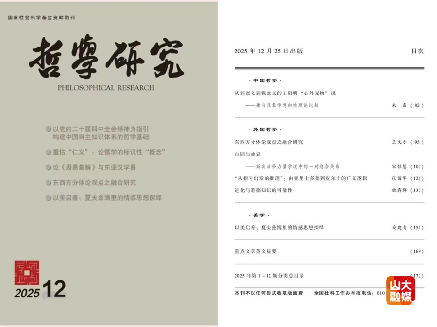 [本站讯]近日,山东大学哲学与社会发展学院王文方教授在核心期刊《哲学研究》2025年第12期发表高质量论文《东西方分体论观点之融合研究》,该文同时被选为本期封面推荐论文。
