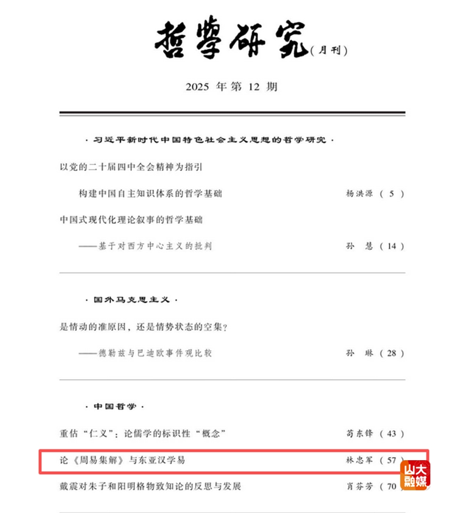 [本站讯]近日,山东大学易学与中国古代哲学研究中心教授林忠军在《哲学研究》2025年第12期发表题为《论〈周易集解〉与东亚汉学易》的论文。