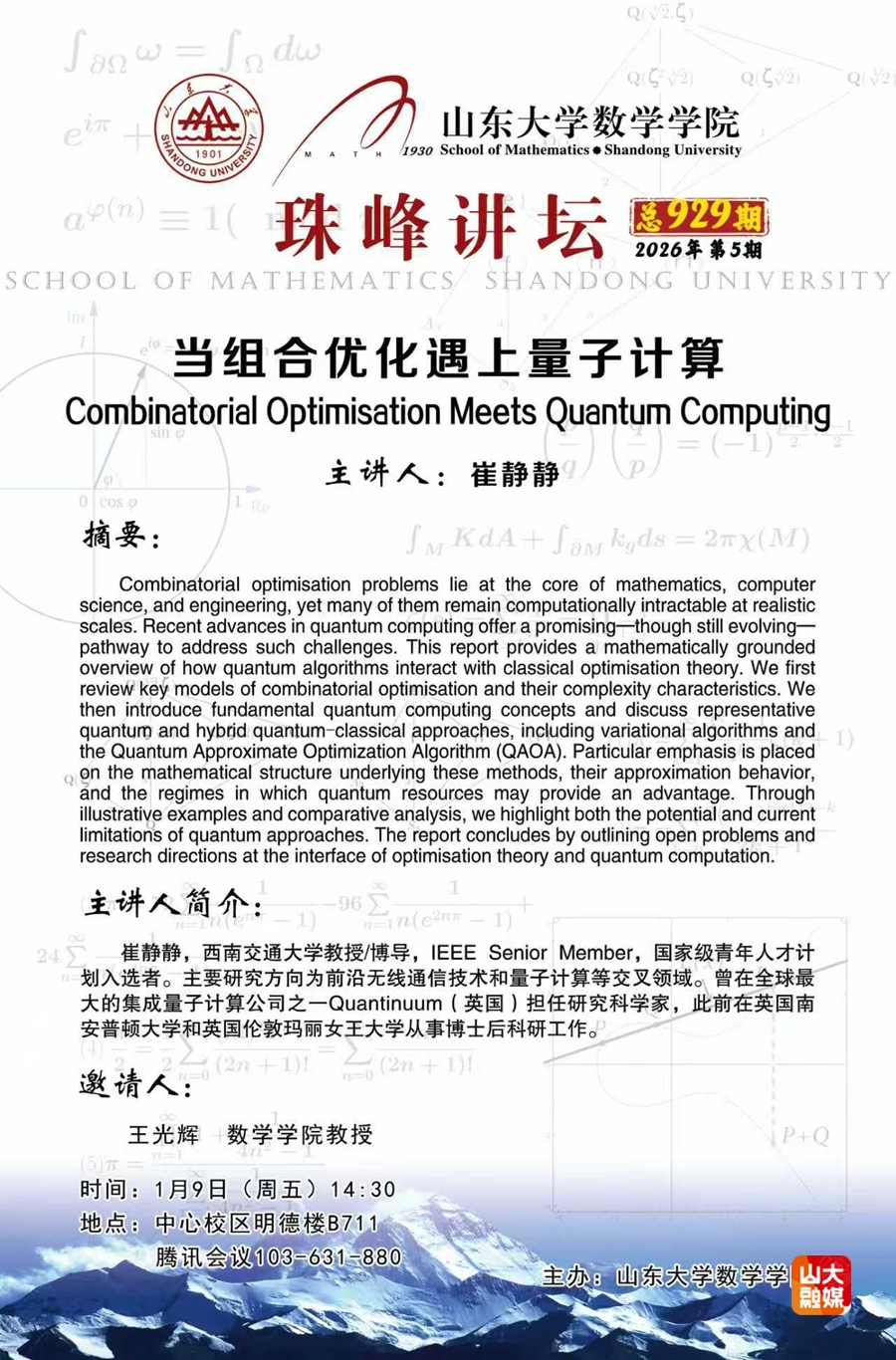 数学学院珠峰讲坛第929期:当组合优化遇上量子计算Combinatorial Optimisation Meets Quantum Computing