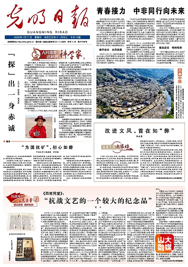 [本站讯]1月11日,文学院教授宫立在《光明日报》头版“铭记历史 缅怀先烈·抗战中的文艺力量”专栏发表题为《〈四世同堂〉:“抗战文艺的一个较大的纪念品”》的文章。