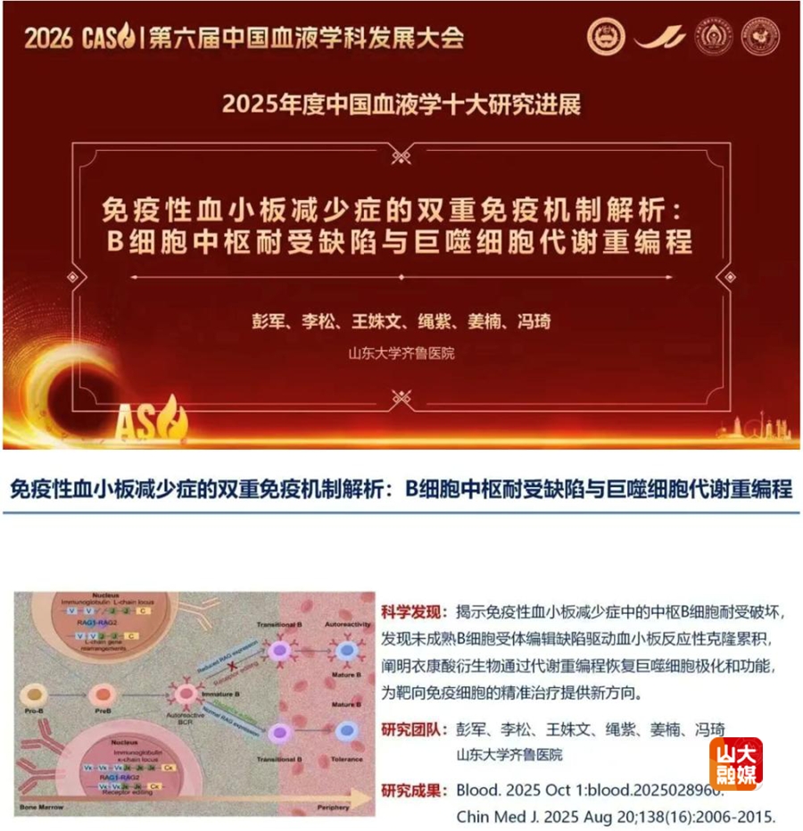 [本站讯]1月11日,第六届中国血液学科发展大会(CASH 2026)在天津举行闭幕式,大会揭晓了“2025年度中国血液学十大研究进展”。山东大学齐鲁医院彭军教授团队完成的研究项目“免疫性血小板减少症的双重免疫机制解析:B细胞中枢耐受缺陷与巨噬细胞代谢重编程”成功入选。