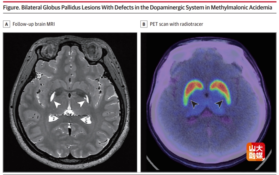 研究团队成员在2026年1月份JAMA Neurology(中科院一区Top,IF = 21.3)上发表病例报告,首次通过多巴胺转运蛋白PET成像,在一例因甲基丙二酸血症(MMA)导致严重全身性肌张力障碍的患者中,发现了双侧壳核多巴胺转运体结合下降的直接证据,从而将MMA相关运动障碍与多巴胺能系统缺陷直接关联。基于此发现,团队采用多巴胺能药物联合治疗,使患者症状获得改善。这一研究不仅深化了对MMA神经损伤机制的认知,更为此类难治性运动障碍提供了新的干预思路和确凿依据。该研究由齐鲁医院青岛院区医师张建园为第一作者,齐鲁医院教授赵玉英、齐鲁医院青岛院区教授赵翠萍为共同通讯作者。