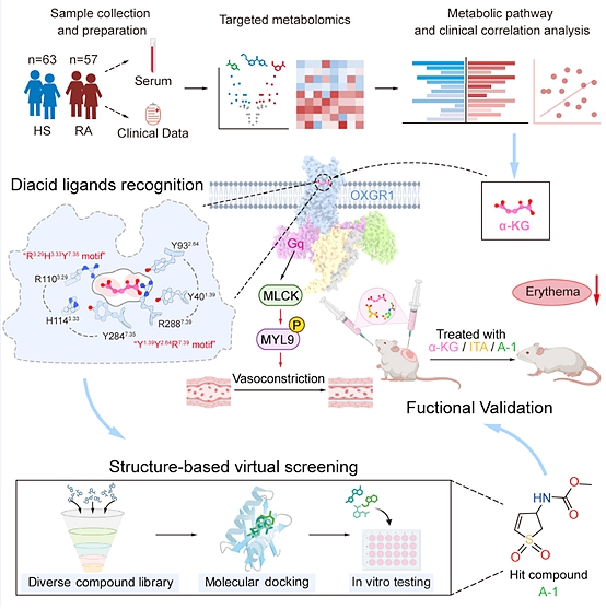 研究团队基于临床代谢组学分析,首先发现玫瑰痤疮患者血清中关键代谢物α-酮戊二酸(α-KG)水平显著升高,且其含量与患者红斑严重程度呈明确正相关。深入的机制研究表明,α-KG可通过特异性结合并激活血管平滑肌细胞膜上的GPCR家族受体OXGR1,进而激活下游Gq信号通路,增强肌球蛋白轻链激酶(MLCK)依赖的肌球蛋白轻链9(MYL9)磷酸化。该信号级联反应可直接促进血管平滑肌收缩,有效抑制玫瑰痤疮的病理性血管扩张,从而显著缓解疾病相关红斑表型。