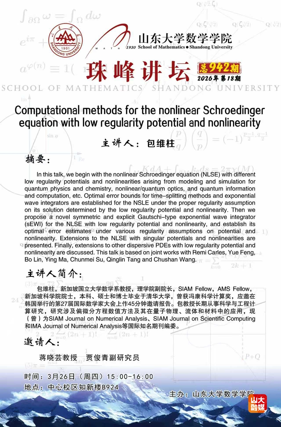 数学学院珠峰讲坛第942期:Computational methods for the nonlinear Schroedinger equation with low regularity potential and nonlinearity