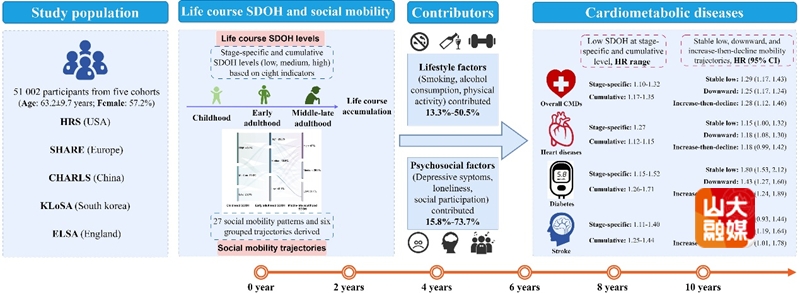 团队采用多队列整合研究设计,在European Journal of Preventive Cardiology发表题为“Life-Course Social Mobility and Cardiometabolic Disease: Evidence from Five International Cohorts”的论文。本研究基于五个国际纵向队列数据,发现全生命周期各阶段及累积SDOH水平较低者发生CMDs的风险显著升高,其中童年低水平SDOH与糖尿病风险升高相关,而中晚年阶段SDOH较低则与CMDs各亚型风险增加一致相关。与全生命周期中持续保持较高SDOH水平的参与者相比,拥有持续低水平、逐渐下降及先升后降社会流动轨迹者的CMDs风险显著增加,其中逐渐下降的流动轨迹与CMDs各亚型风险增加一致相关。进一步分析结果表明,饮酒、体力活动、抑郁症状及社会参与等因素对上述关联具有重要解释作用,且在与心脏病和卒中关联中的贡献更为突出。该研究提示,在心血管疾病防控中除倡导健康生活方式外,还应同步加强心理健康促进,并鼓励个体积极参与社会活动,维持良好的心理状态和社会适应能力。该文以山东大学为第一和通讯作者单位,李响为本文第一作者,朱东山教授为唯一通讯作者。