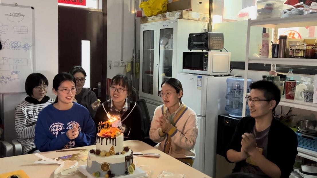 唱完歌后,副研究员姜老师亲自为大家分美味的蛋糕,大家边吃边聊,其乐融融。