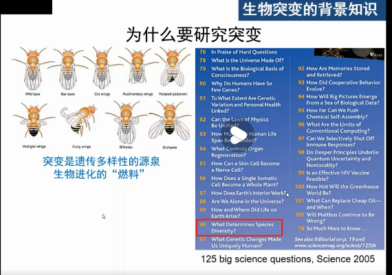 龙红岸教授首先从为什么研究生物突变这一科学问题着手,归纳了生物突变与人类疾病间的必然联系,罗列了视网膜母细胞瘤、遗传性结直肠癌等疾病与基因突变的因果关系,使我们意识到研究突变的客观规律对明确遗传多样性及人类健康的指导意义。