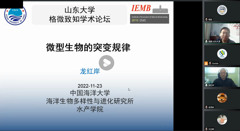 11月23日下午,2022年第十期格微致知学术论坛顺利开讲。中国海洋大学海洋生物多样性与进化研究所的龙红岸教授受邀参加“格微致知”研究生学术论坛,作了题为“微型生物的突变规律”的学术报告。本次报告由微生物技术研究院高翔教授主持,研究院134名师生线上参加会议。