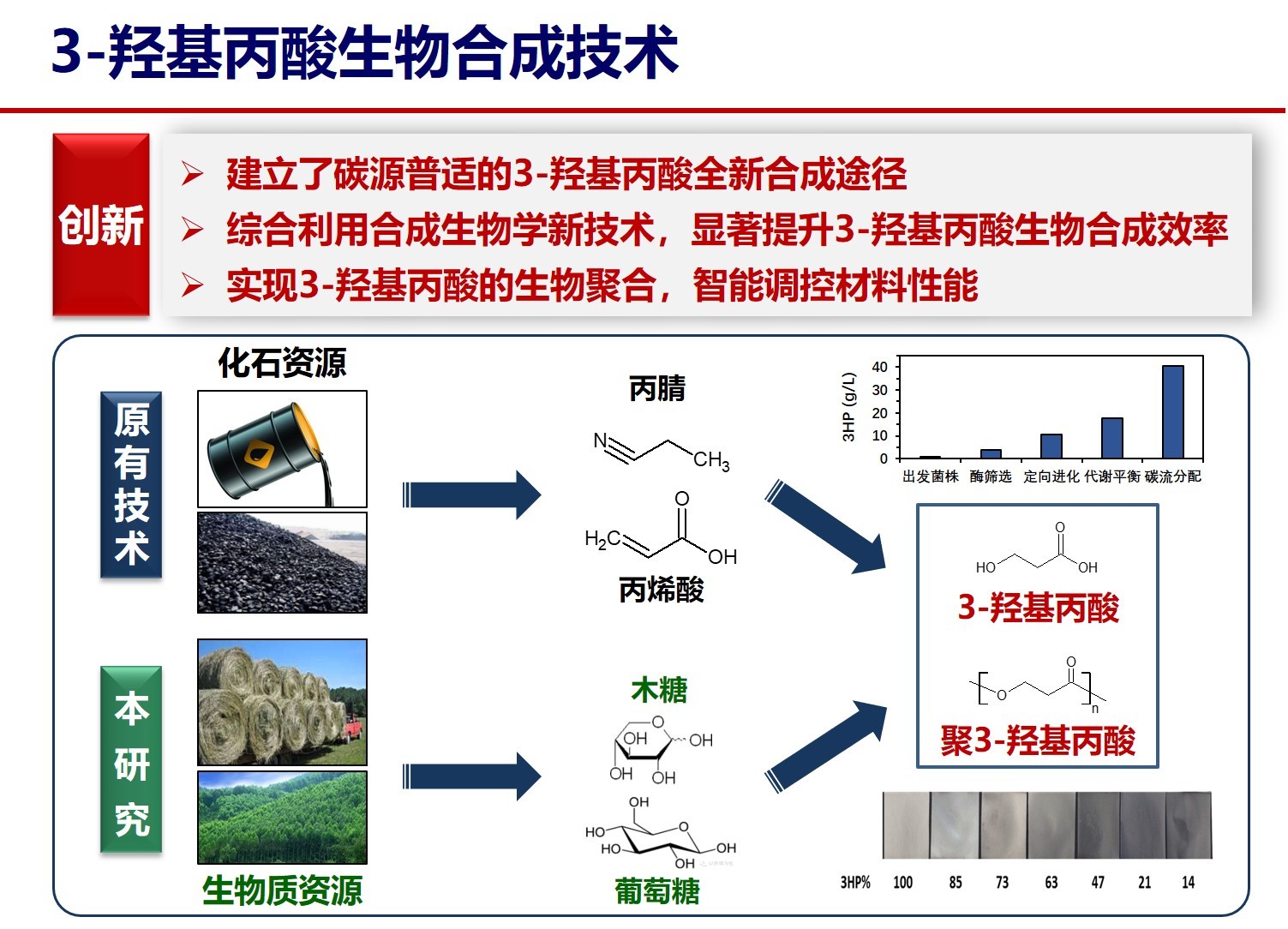 1. 在生物基材料和化学品方面,针对生物合成中的瓶颈问题,在廉价碳源利用、转化效率提升、产品性能优化等方面取得了突出成果,建立了制备3-羟基丙酸和丁三醇等重要化学品的生物合成系统,实现了廉价可再生原料的高效生物转化,完成了生物合成技术的中试应用验证;同时提出了多功能蛋白拆分的代谢工程新思路,建立了细胞内碳代谢流再分配调控策略和生物基高分子性能调控策略等。以该成果为基础获基金委优秀青年基金资助。