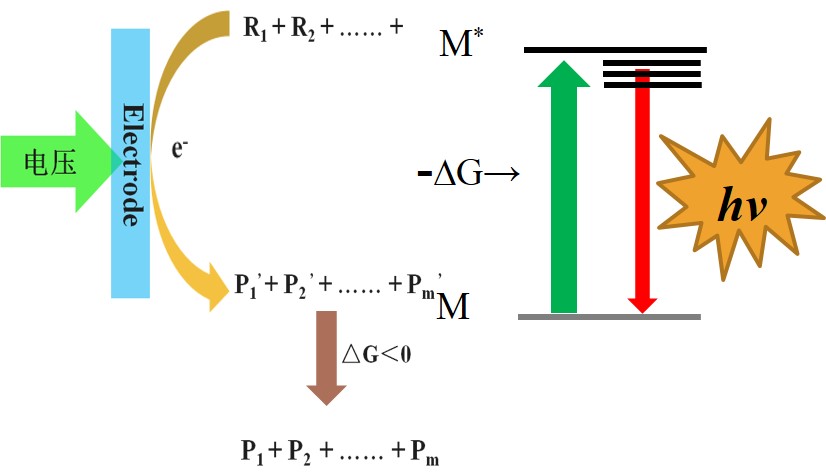 ECL辐射的基本原理在于采用依靠电化学手段使体系中电生物质之间或电生物质和某些物质之间发生化学反应,并最终使得体系中的某种物质达到激发态、产生光辐射 (如下图所示)。