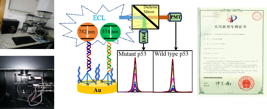 基于创新理念研发全新原理的光强型电致化学发光分析系统,对于突破跨国公司在我国临床诊断市场的垄断具有重要的意义。受显微镜系统二向色镜透/反分光原理的启发,本课题组试制了一套PMT型双色ECL分析仪样机,该样机利用二向色镜将两种不同波段的ECL辐射分别传输至两个PMT,可开展双色ECL分析传感研究。硕士生和玉鹏同学参与了双光路光强型ECL分析系统的构建,本课题组已经基于该装置分别实现了肿瘤抑制因子p53和mp53的同时测定(Anal. Chem. 2018, 90, 5474)及抗原CA25和AFP的同时测定(Biosen. Bioelectron. 2018, 115, 77)。