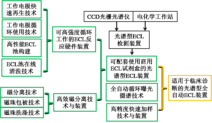 截止到目前,绝大多数ECL分析的基础与应用研究均基于PMT型ECL分析仪实现。罗氏公司通过推出集免疫学、链酶亲合素/亲生物包被技术、磁分离技术和电致化学发光(ECL)标记技术于一体的光强型全自动电化学发光分析仪及以钌联吡啶为ECL发光物的配套试剂盒而在世界范围内垄断了商业化ECL生化分析和临床诊断市场。基于原始创新理念研发全新原理的光谱型电致化学发光分析系统,对于推动ECL基础与应用研究、突破跨国公司对体外诊断市场的垄断具有重要的意义。
