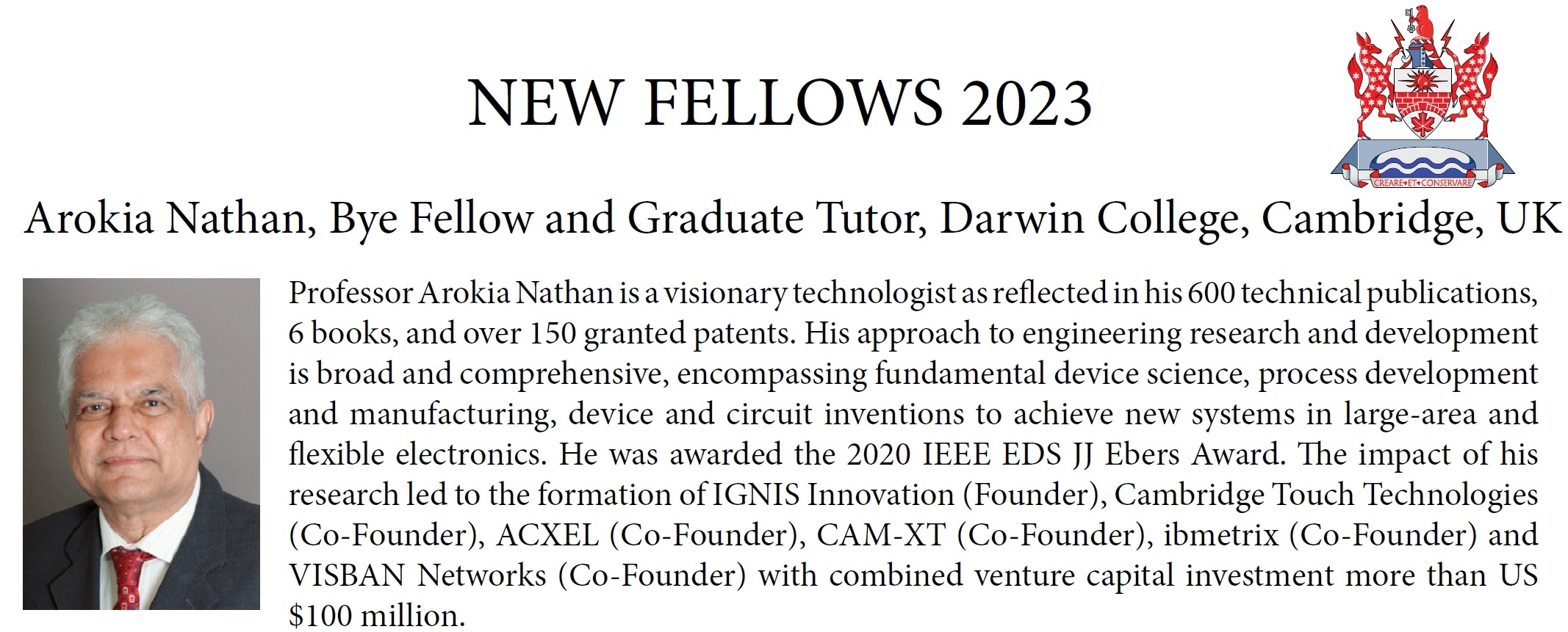 2023年,信息学院Arokia Nathan教授当选加拿大工程院院士。