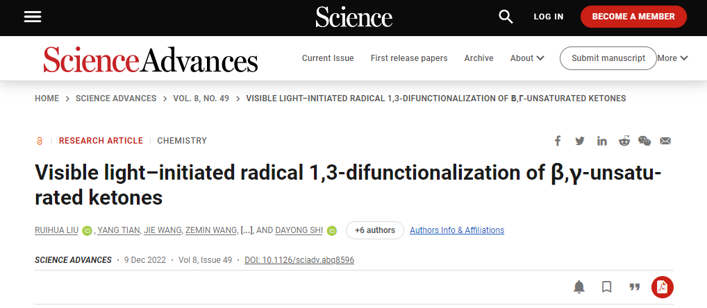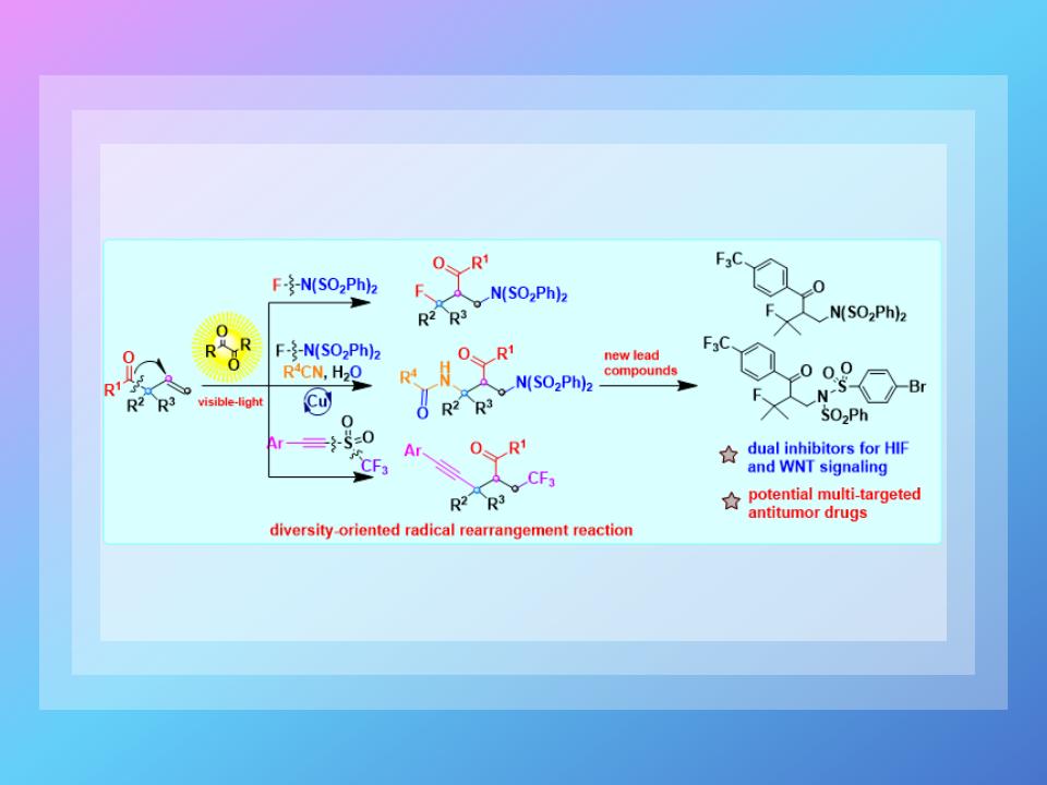 该课题组近期以多样化导向合成思想为指导,以结构简单、容易获得的β,γ-不饱和酮为原料,廉价偶酰类光引发剂,NFSI和三氟甲磺酰炔等作为双功能化试剂,首次实现了可见光引发下,经由1,2-酰基迁移β,γ-不饱和酮的1,3-氨氟化、双氨化和三氟甲基炔基化反应。快速构筑了三大类超过80种1,2,3-依次不同官能团取代的烷基骨架。此外,该策略也为β,γ-不饱和酮类化合物的光化学重排反应提供了新模式。