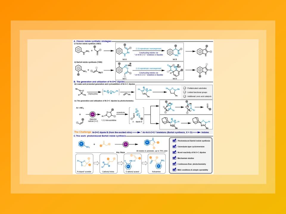 本文首次报道了一种光诱导Bartoli吲哚合成方法,通过激发态硝基芳烃对烯烃的氧化裂解,成功获得多种吲哚和氮杂吲哚衍生物。N-O=C偶极子新的产生方式和反应性增强了对偶极化学的理解。机理研究和DFT计算支持该反应涉及自由基环加成、臭氧解型环裂解、羰基亚胺中间体分子内氢迁移以及O-烯基羟胺的3,3-σ重排等过程。特别地,采用连续流动光化学技术显著提高了反应效率,克服了商业化过程中存在的障碍。