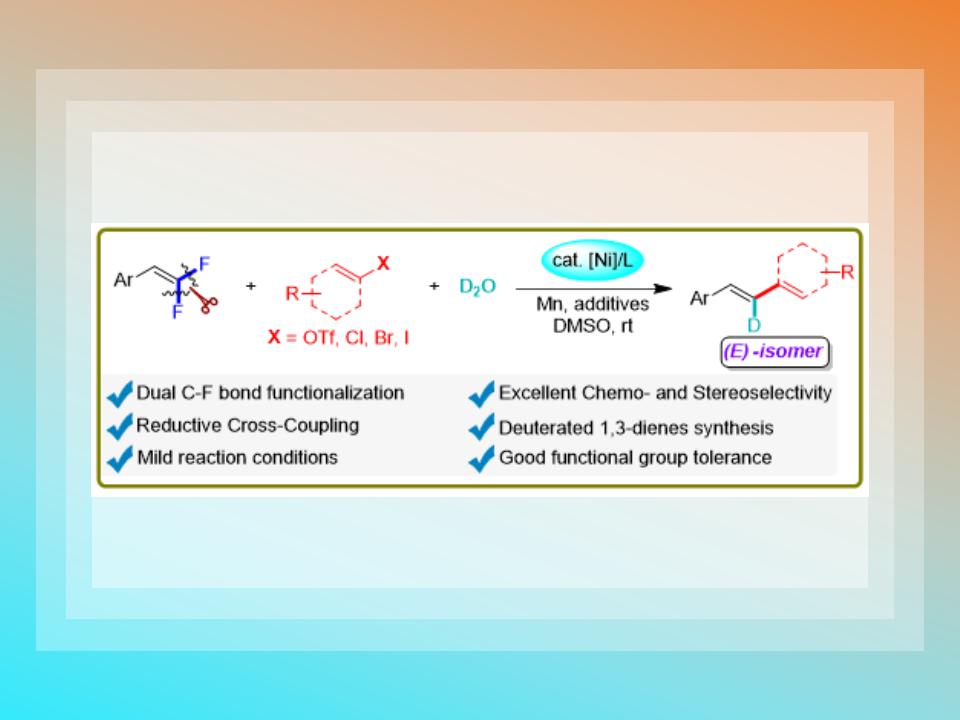 在该研究工作中,作者以结构简单、容易获得的谐二氟烯烃为原料,锰粉为还原剂,三氟甲磺酸烯醇酯和氘水作为双功能化试剂,在镍催化下,经由还原性连续脱氟,首次一锅实现了谐二氟烯烃的烯化和氘化反应。