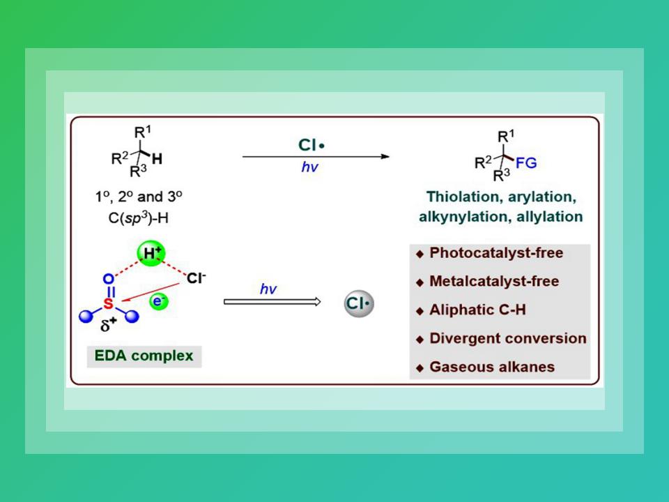 为了填补该不足,我们利用HCl和SIV=O基团组成的EDA复合物实现了脂肪烃碳氢键多样性转化。其中作为有效氢原子转移试剂的氯自由基可经由质子耦合电子转移途径生成,并以此发展了C(sp3)-H硫代、芳基化、烯丙基化、炔基化等多种反应,且无需光催化剂和金属催化剂的参与。同时,对该新颖转化机制进行了深入探索,包括各种对照试验、中间体捕获、光谱检测、DFT计算等。该转化具备多种优良特性,包括简单温和的反应条件、较好的官能团兼容性与底物普适性,特别是为大宗气态烷烃的高附加值绿色转化提供了一种可选择的解决方案。