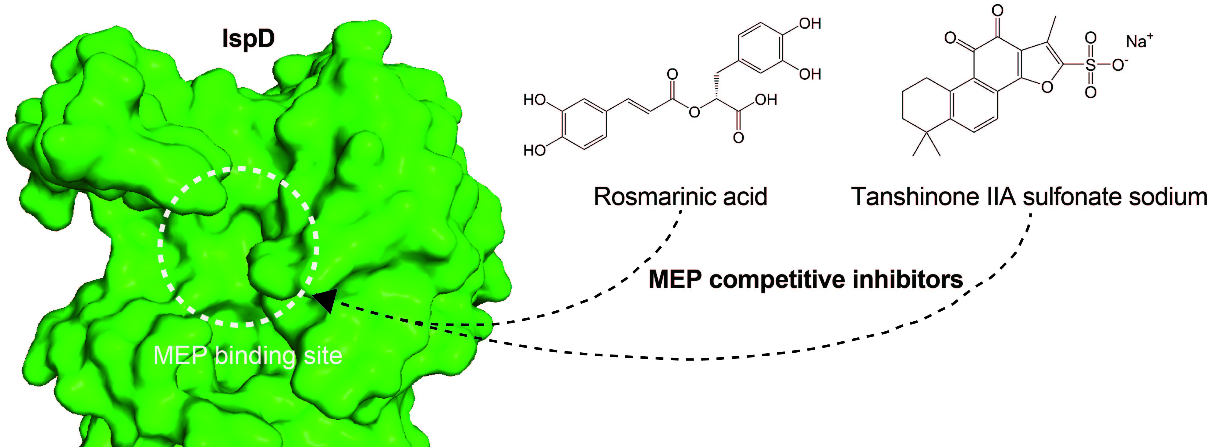 本研究对细菌、植物以及顶复门生物特有的异戊二烯合成通路——MEP通路中的关键蛋白IspD展开研究。运用蛋白热迁移实验(TSA)和虚拟筛选技术,我们从包含上市药物和药典收录化合物在内的近两万种化合物中,筛选出了27种与IspD蛋白具有较强结合潜力的化合物。在此基础上,通过进一步的酶学实验验证,我们从中筛选出两种抑制活性较好的IspD抑制剂——迷迭香酸和丹参酮IIA磺酸钠,这两种化合物均为IspD底物MEP的竞争性抑制剂。最小抑菌浓度测试证明丹参酮IIA磺酸钠对幽门螺杆菌SS1菌株具有一定的抑菌作用。本研究不仅为IspD蛋白的结构特征和作用机制提供了更丰富的信息,也为未来开发针对IspD酶的抗菌药物提供了新的苗头化合物。