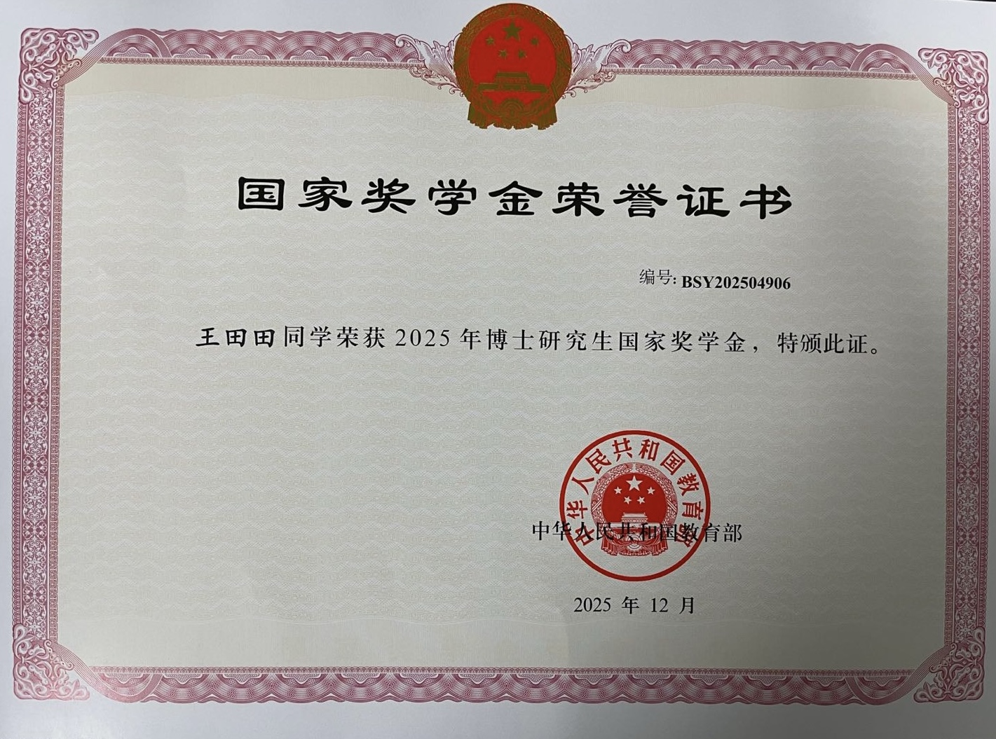 博士国家奖学金-王田田