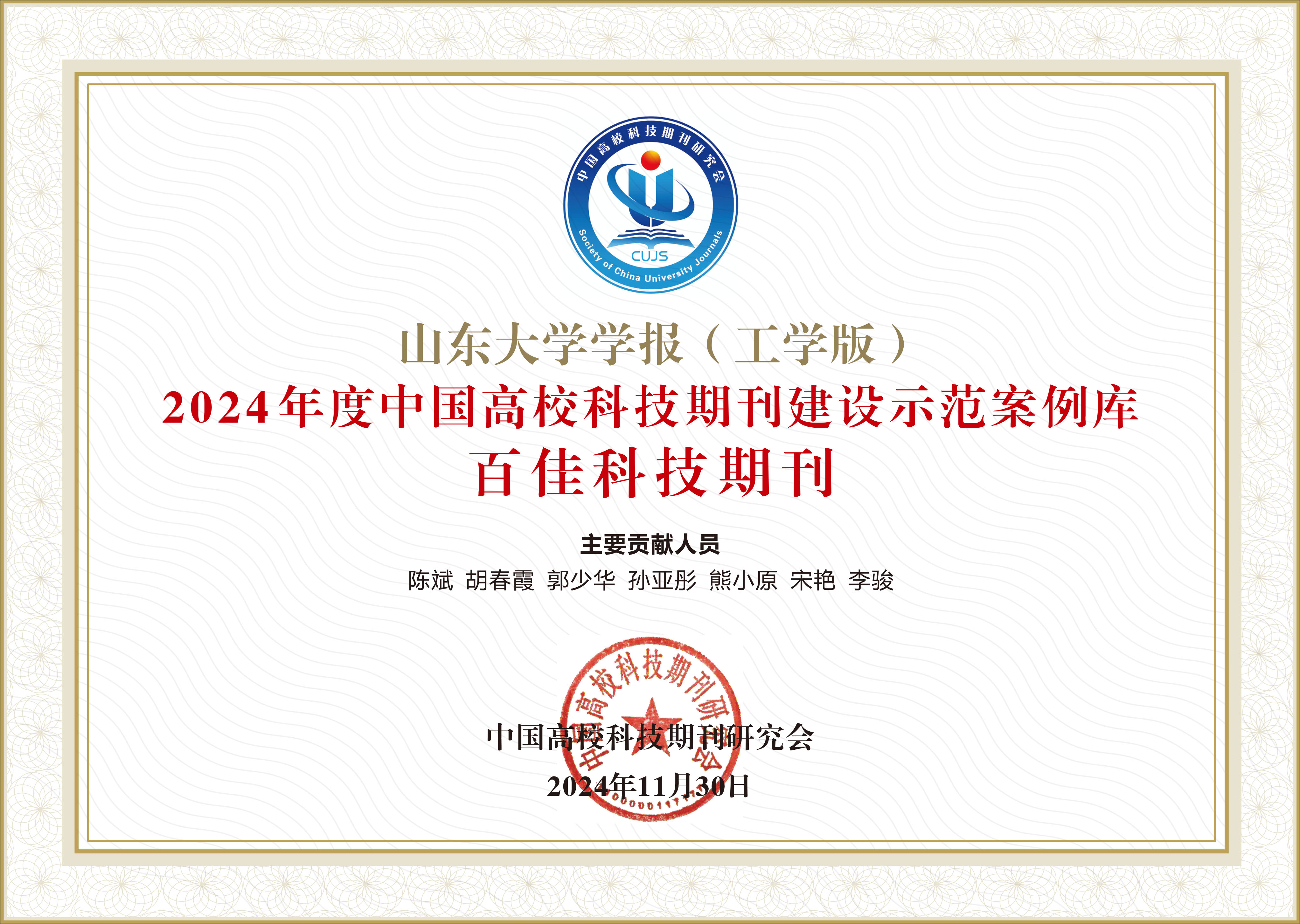 获奖名称:中国高校科技期刊建设示范案例库百佳科技期刊《山东大学学报(工学版)》