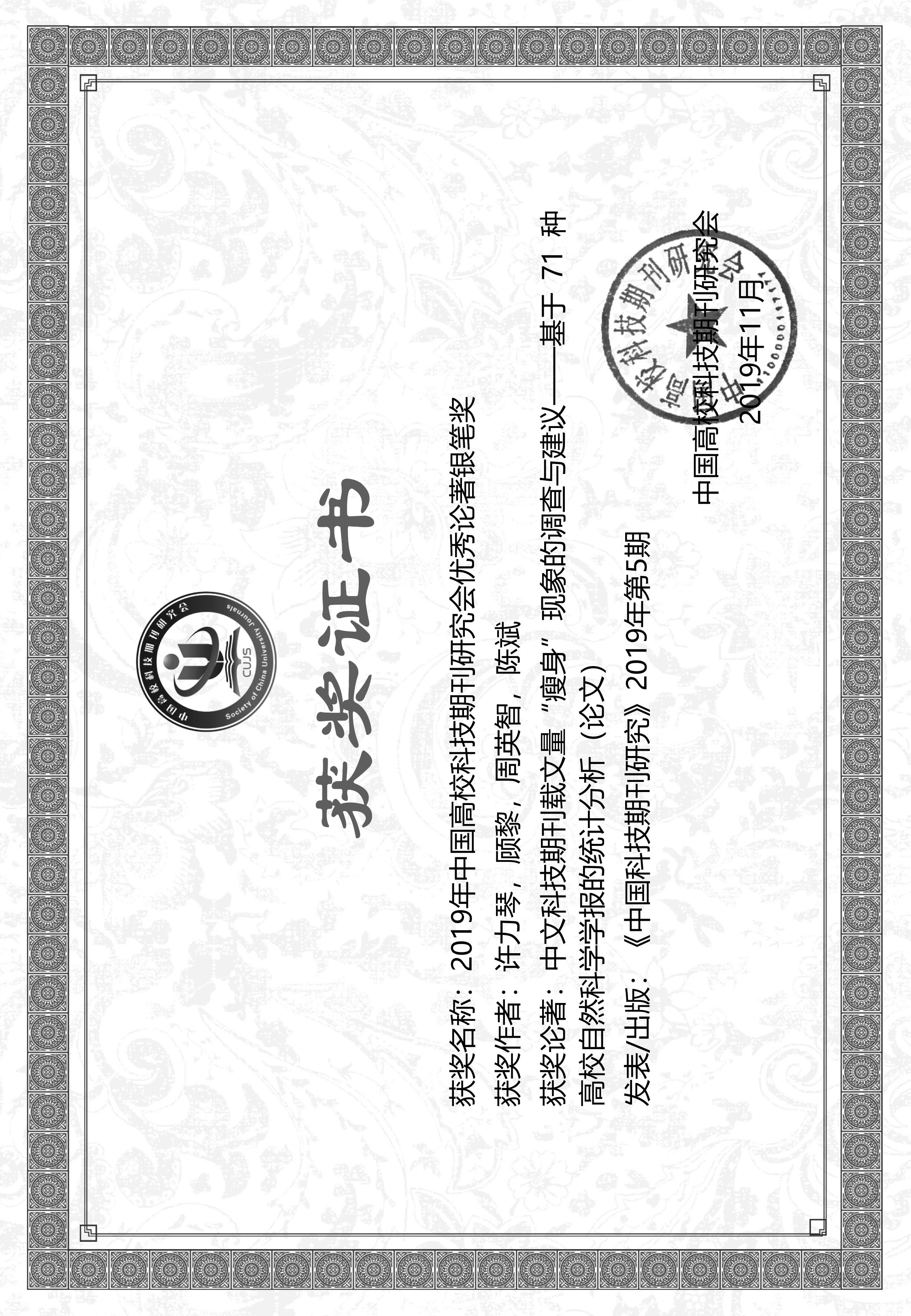 获奖名称:2019年中国高校科技期刊研究会优秀论著银笔奖