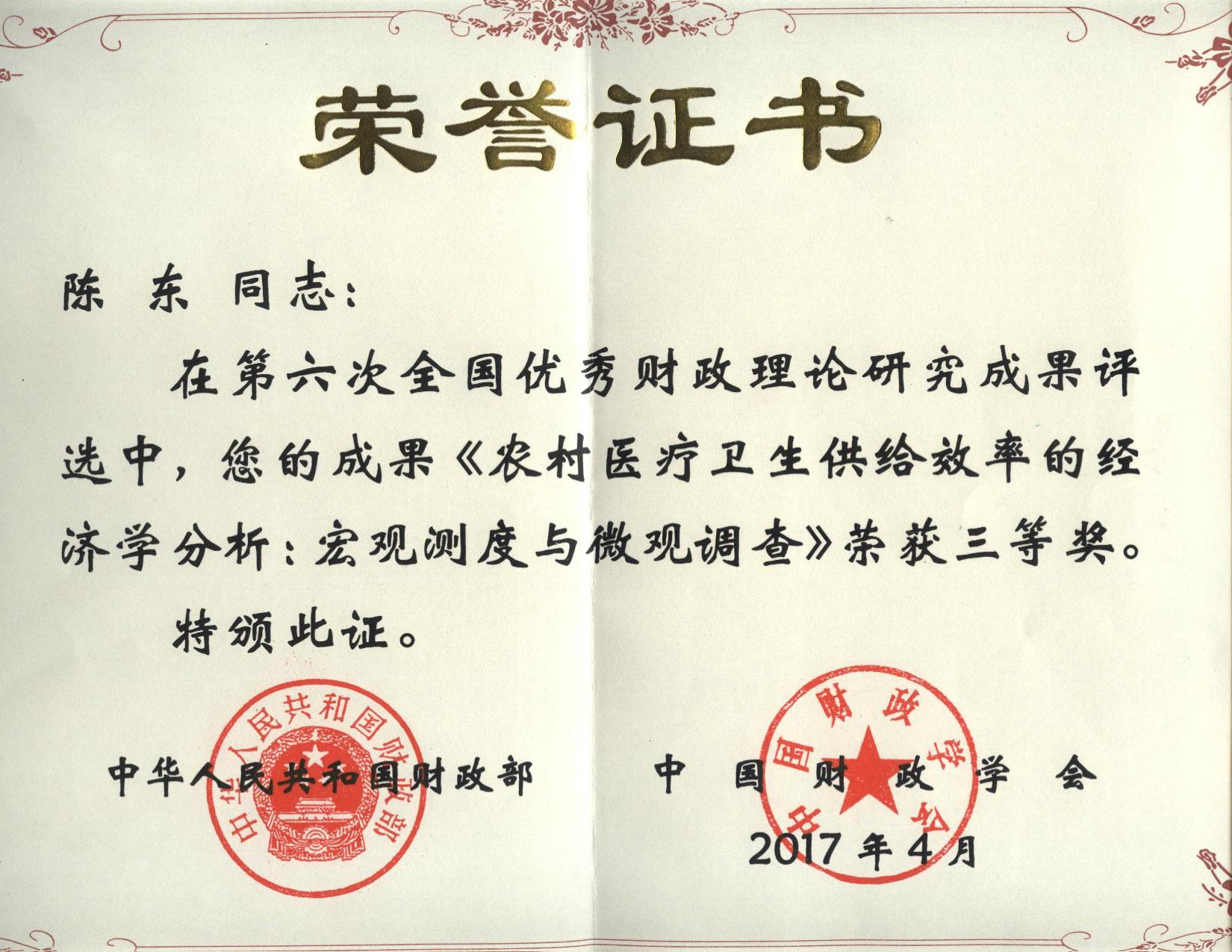 2017曾获荣誉当选: 第六次全国优秀财政理论成果评选三等奖