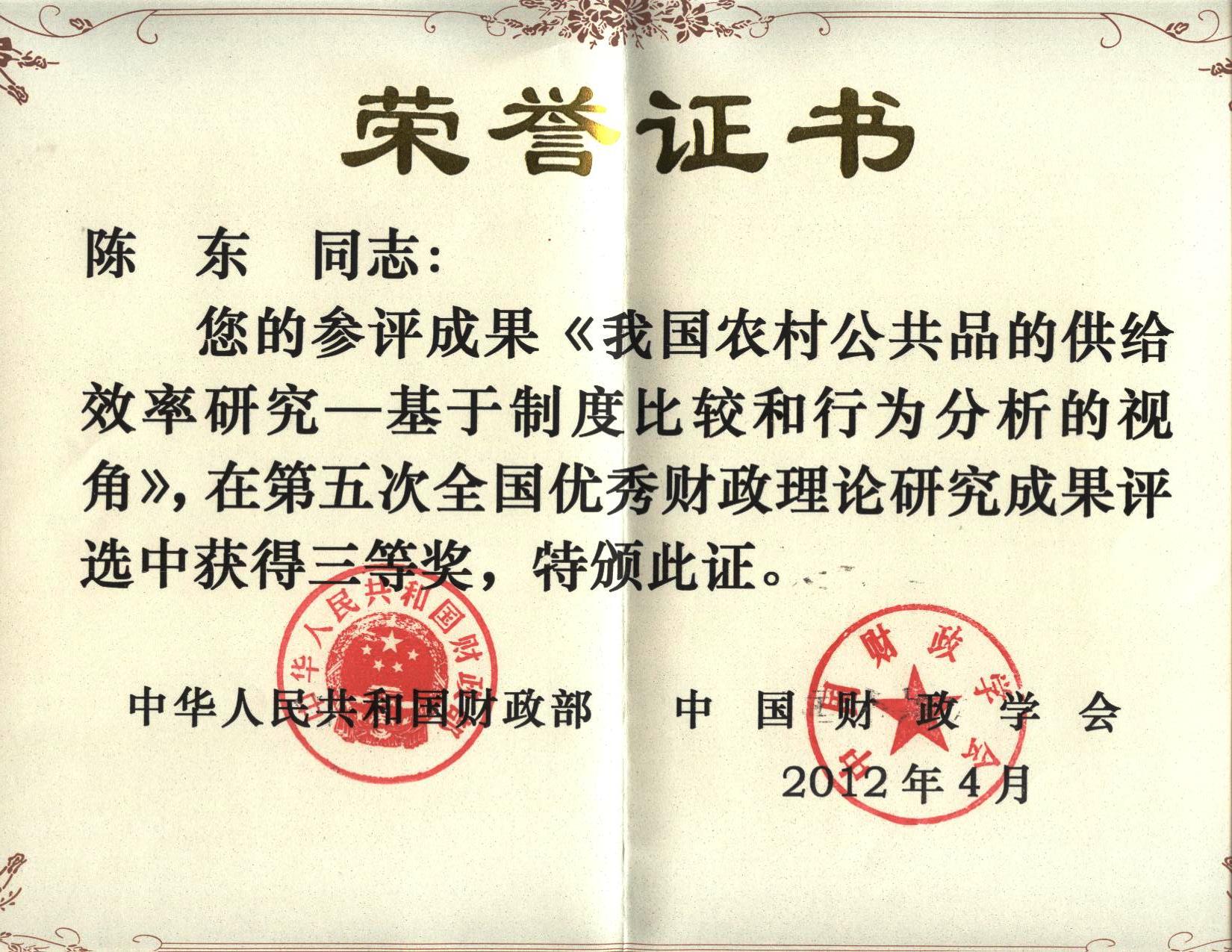 2012曾获荣誉当选: 第五次全国优秀财政理论成果评选三等奖