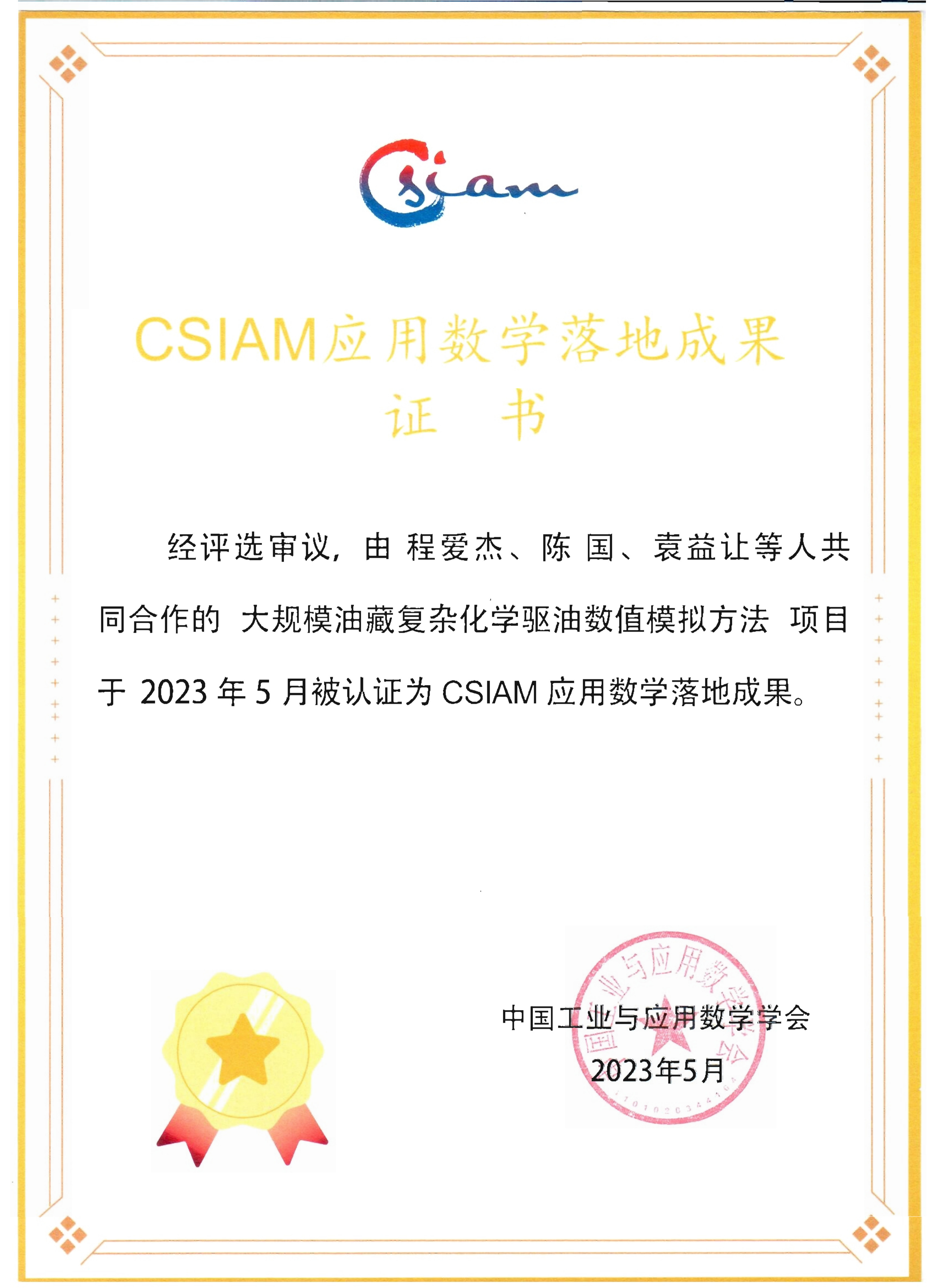 获奖名称:中国工业与应用数学学会2023年应用数学落地成果
