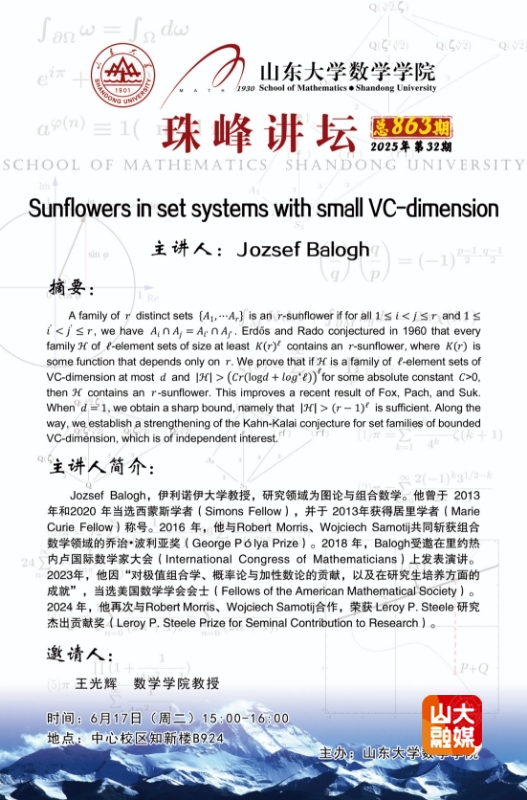 数学学院珠峰讲坛第863期:Sunflowers in set systems with small VC-dimension