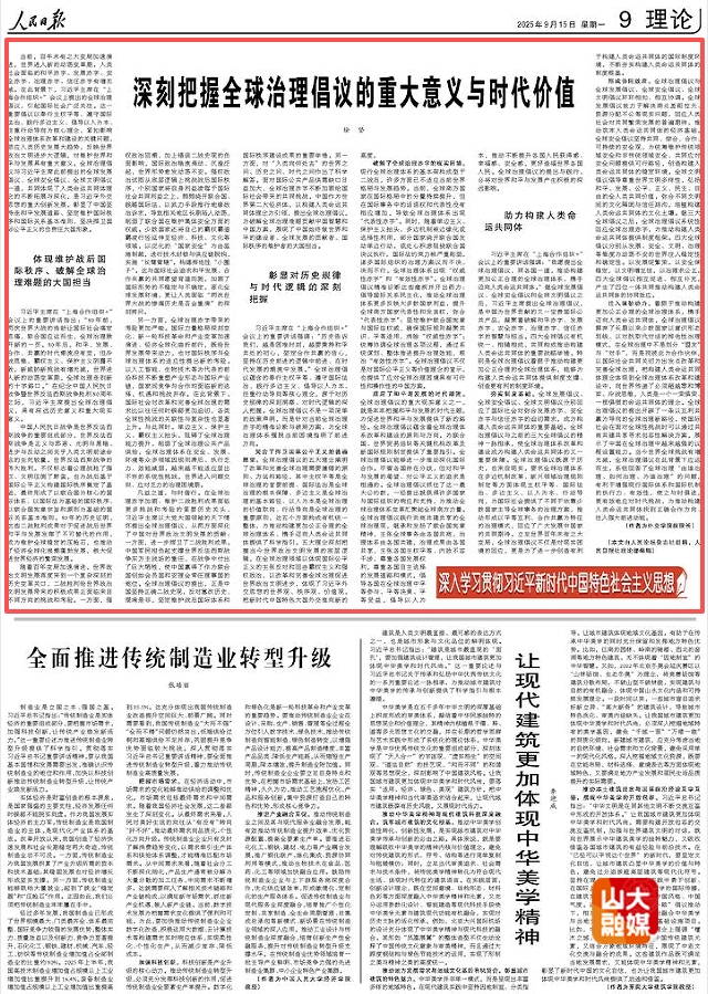 [本站讯]9月15日,山东大学讲席教授、外交学院原院长徐坚在《人民日报》发表题为《深刻把握全球治理倡议的重大意义与时代价值》的理论文章。文章指出,全球治理倡议与习近平主席此前提出的全球发展倡议、全球安全倡议、全球文明倡议一道,体现了维护战后国际秩序、破解全球治理难题的大国担当,彰显了对历史规律与时代逻辑的深刻把握,有助于构建人类命运共同体,是习近平外交思想的重大创新发展。