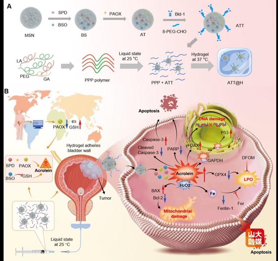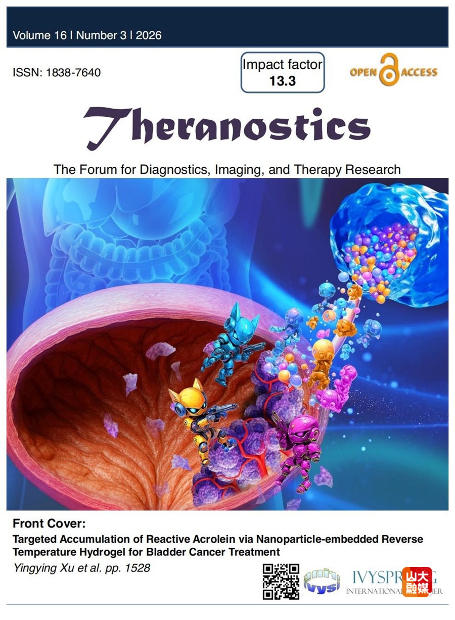 [本站讯]近日,山东大学齐鲁医院泌尿外科主任俞能旺教授团队在治疗膀胱癌研究方面取得新进展,相关论文“Targetedaccumulation ofreactiveacrolein viananoparticle-embeddedreversetemperaturehydrogel forbladdercancertreatment”已被Theranostics(中科院1区,IF=13.3)被选做封面文章(Front Cover)发表。俞能旺教授为最后通讯作者,泌尿外科博士后许莹莹、硕士研究生杜庆龙、主治医师赵中伟为共同第一作者,泌尿外科博士后秦鑫、神经外科副研究员耿慧敏为共同通讯作者,山东大学齐鲁医院为第一作者和通讯作者单位。