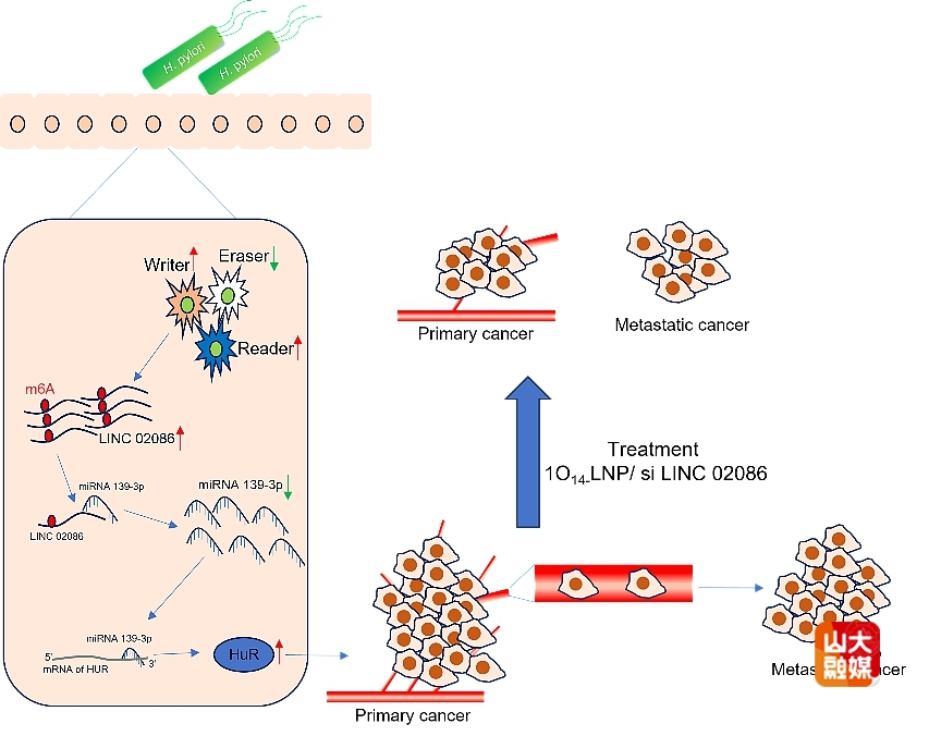 研究团队进一步揭示了LINC02086的作用机制:其主要通过竞争性吸附miR-139,解除对促癌基因HuR的抑制,从而促进胃癌细胞的增殖、迁移与侵袭;同时,H. pylori感染可增强LINC02086的m6A修饰并上调其表达,表明HP–m6A–LINC02086–miR-139–HuR轴在胃癌发生中具有关键作用。基于此,团队构建了脂质纳米颗粒(LNP)递送的siRNA体系(1O14-LNP/siLINC02086),其在体内外均有效抑制胃癌细胞增殖及转移,并在异种移植与肝转移模型中显著降低肿瘤负荷。综上,本研究系统阐明了LINC02086在胃癌进展中的关键功能,明确其血清标志物的诊断潜力,并提出 LNP-siRNA 靶向干预策略,为胃癌的早期诊断和精准治疗提供新的理论依据与创新方向。本研究得到了山东大学化学院教授杨传旭、山东省立医院教授王允山的支持。