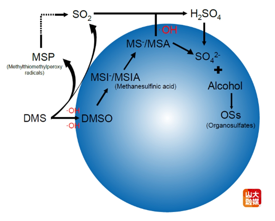 有机硫酸酯(OS)是海洋气溶胶中的重要有机组分,在大气氧化能力、云凝结核活性和区域气候调控中均发挥关键作用,在海洋大气中多被视作一次排放。本研究通过外场观测、实验室模拟与模型计算相结合,首次明确指出:海洋微液滴表面的自发氧化过程,提供了快速且高效的OS生成通道,是海洋大气中OS的主要来源。团队研究发现,海洋微液滴表面能够自发产生羟基自由基(•OH),大量•OH在微液滴界面迅速氧化二甲硫醚(DMS),生成硫酸盐。在酸性环境中,溶解在海水中的醇类与硫酸盐发生酯化反应形成OS。模型计算结果表明,由微液滴界面自发氧化路径贡献的全球OS产量高达13.96 ± 10.99 Tg·yr-1,与陆源异戊二烯衍生OS的全球产量相当,表明海洋大气中OS主要来自这一快速的二次化学过程,而非简单的一次排放。该研究结果深化了对海洋气溶胶中OS形成机制的理解,为进一步解析海洋挥发性有机物在海-气界面的转化机制提供了新视角。