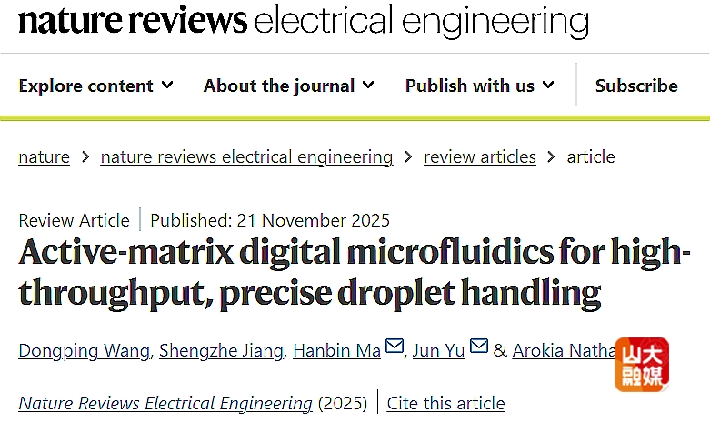 [本站讯]近日,信息科学与工程学院Arokia Nathan院士、于俊教授团队在国际顶级综述期刊Nature Reviews Electrical Engineering发表题为“Active-matrix digital microfluidics for high-throughput, precise droplet handling”的综述文章,首次系统阐明有源矩阵数字微流控的基本原理及技术路线,并前瞻其在精准医疗等前沿领域的应用前景。山东大学信息科学与工程学院助理研究员王东平、博士研究生姜圣哲为该文章共同第一作者。中国科学院苏州医工所、电子科技大学教授马汉彬,于俊教授、Arokia Nathan院士担任共同通讯作者。山东大学为第一通讯单位。这是山东大学首次在该期刊上发文。