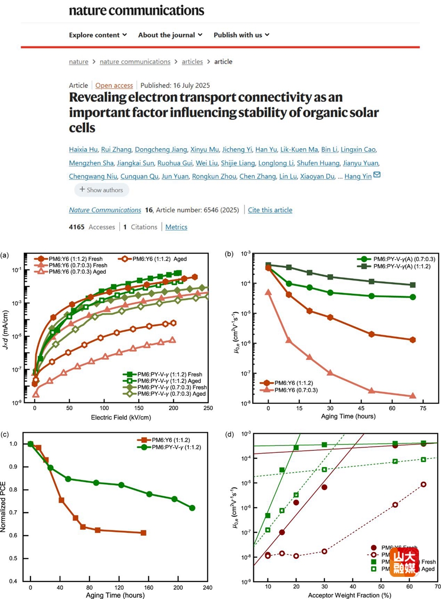 进展二:在推进有机光伏商业化的过程中,器件稳定性成为首要挑战。研究团队表明,电子传输连通性是决定有机光伏器件中电子传输和器件稳定性的关键因素。与小分子受体相比,较大尺寸的聚合物受体可能会建立具有卓越连通性的电子传输网络。这些发现将为提高有机光伏性能稳定性的材料选择和方法提供新的视角。相关研究成果以“Revealing electron transport connectivity as an important factor influencing stability of organic solar cells”为题发表于Nature Communications,山东大学博士研究生胡海霞、姜东成,林雪平大学教授张睿为论文第一作者。通讯作者为山东大学教授殷航、香港科技大学教授颜河,山东大学为第一作者单位和通讯作者单位。
