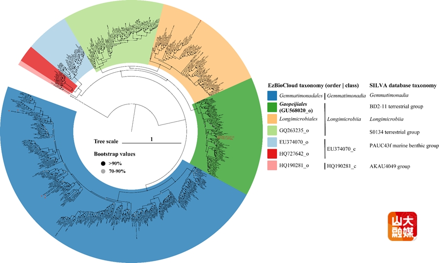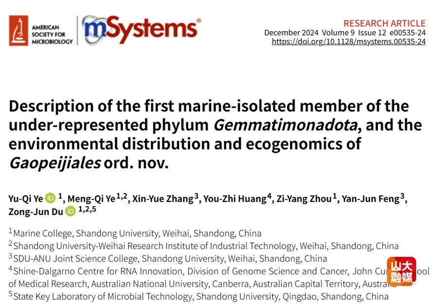 [本站讯]近日,海洋学院杜宗军教授团队在海洋微生物系统学研究方面取得重要研究进展,发现并命名一个新的海洋细菌目--“高培基菌目(Gaopeijiales)”,该成果以“Description of the first marine-isolated member of the under-represented phylum Gemmatimonadota, and the environmental distribution and ecogenomics of Gaopeijiales ord. nov.”为题发表在国际系统分类学著名期刊mSystems,海洋学院博士研究生叶裕祺为第一作者,杜宗军教授为通讯作者,山东大学为独立完成单位。目前,该细菌目已获International Journal of Systematic and Evolutionary Microbiology的有效认证,正式录入国际细菌分类目录。