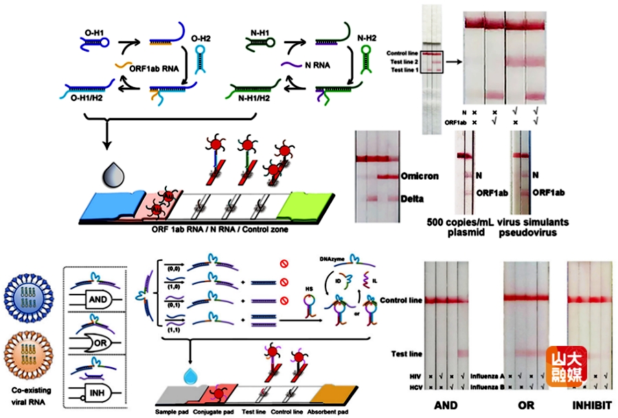 团队针对新冠肺炎疫情中核酸检测依赖逆转录-聚合酶链式反应(RT-PCR)和大型荧光定量PCR仪造成的检测周期长、须集中采样和样本转运等问题,开发了双测试区的侧向流动检测试纸,分别用于指示新冠病毒核酸ORF1ab与N区域核酸序列,利用双重T线各自显色以提高诊断可靠性;通过催化发夹组装与重组酶聚合酶扩增联用,达到与PCR相当的检测限,并实现单碱基突变检测和变异毒株Delta及Omicron分析。团队针对多种呼吸道病毒交替存在的情况,研发出可逻辑(“AND”、“OR”、“INBIHIT”)分析多种病毒核酸共存情况的检测试纸,通过测试线显色即可判定多种病毒同时、其一或排他存在,为病毒共感染分析提供了方便的可视化检测手段。这些方法为相关疫情防控提供了适合个人自检的技术储备。