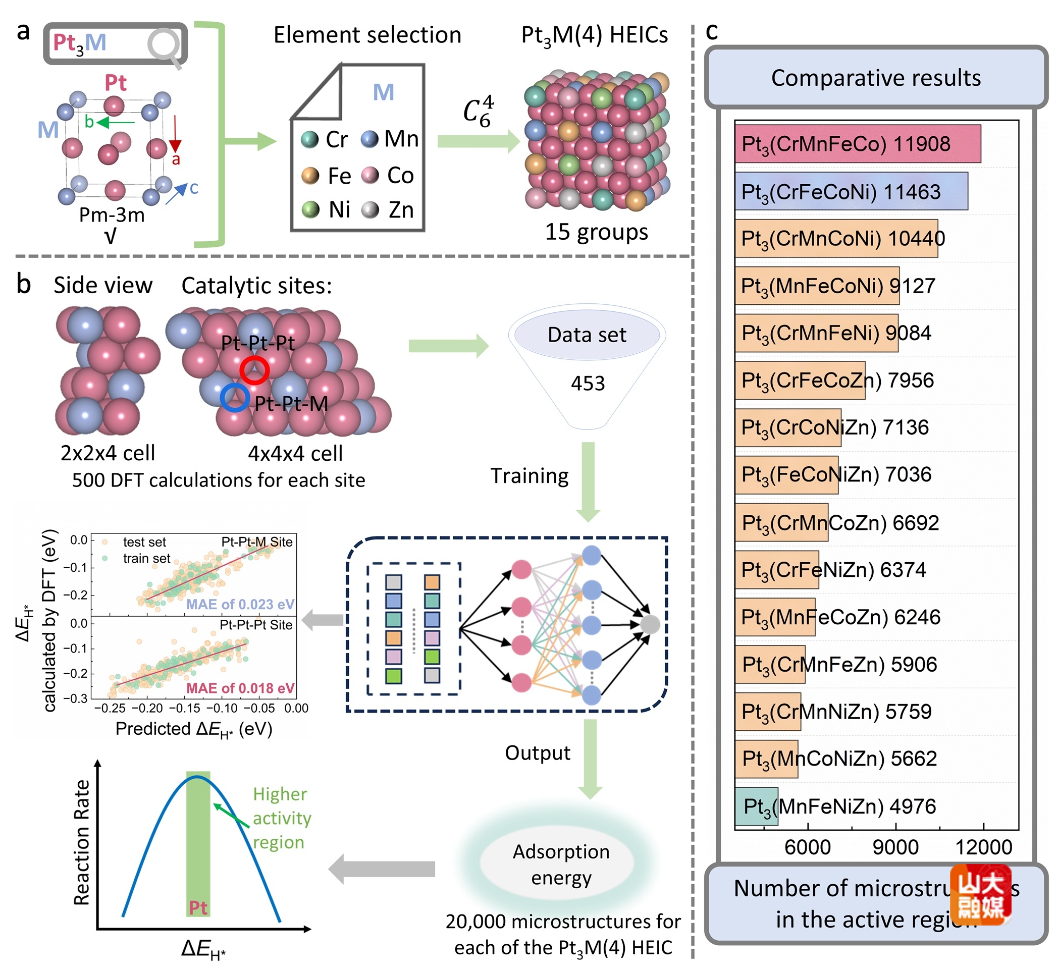 氢能因其高能量密度与零碳排放特性成为理想的清洁能源载体。电催化析氢反应(HER)是实现可持续制氢的重要途径,但其发展受制于高效、低成本催化剂的开发。Pt基合金虽表现出优异的本征活性,然其高昂成本限制了大规模应用。高熵金属间化合物(HEICs)结合了高熵合金的组分多样性与金属间化合物的长程有序性,展现出独特的电子结构与催化潜力。然而,HEICs在实际设计中仍面临两大挑战:其一,其结构在原子尺度上难以兼顾长程晶体学有序与高熵无序环境之间的平衡;其二,多组分体系本身的结构复杂性,加之传统建模方法存在固有局限,阻碍了构效关系的准确建立。为解决上述两大难题,研究团队创新性地提出了一种数据驱动与机器学习相结合的策略,以高效设计L12型Pt基高熵金属间化合物(HEICs)析氢催化剂。研究基于Pm-3m空间群结构,构建了15种五元Pt3M(4) HEICs组合,并利用深度神经网络(DNN)对453组第一性原理计算数据进行训练,实现了对每种组合中20,000种微观结构的H*吸附能(ΔEH*)的高通量预测。通过引入一种基于活性位点分布的统计评估方法,以各组合中处于最优吸附能区间的微观状态数量为标准量化了HER性能。结果表明,Pt3(CrMnFeCo)在宽pH范围内均表现出卓越的催化活性与稳定性,实验结果与机器学习预测结果相符。进一步机制分析揭示,表层Co、Cr、Fe与次表层Ni、Co分别通过优化Pt-Pt-M与Pt-Pt-Pt位点,协同调控H*吸附行为。该研究不仅为高熵催化剂的理性设计提供了新范式,也深化了对多金属体系中活性起源的微观机制理解。
