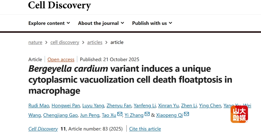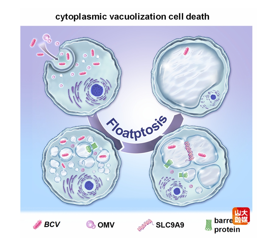 [本站讯]近日,山东大学齐鲁医院检验医学中心张义团队与高等医学研究院齐晓朋团队在国际权威期刊Cell Discovery(中科院一区TOP,影响因子14.3)在线发表了题为“Bergeyella cardiumvariant induces a unique cytoplasmic vacuolization cell death floatptosis in macrophage”的研究长文。该研究系统揭示了一种由新发病原菌Bergeyella cardium变异株(BCV)诱导的全新程序性细胞死亡方式——“Floatptosis”,为理解宿主抗感染免疫机制和发展新型抗感染策略提供了重要理论依据。山东大学齐鲁医院检验医学中心张义、高等医学研究院齐晓朋与徐涛为共同通讯作者;高等医学研究院毛如迪、齐鲁医院检验医学中心潘宏伟等为共同第一作者。