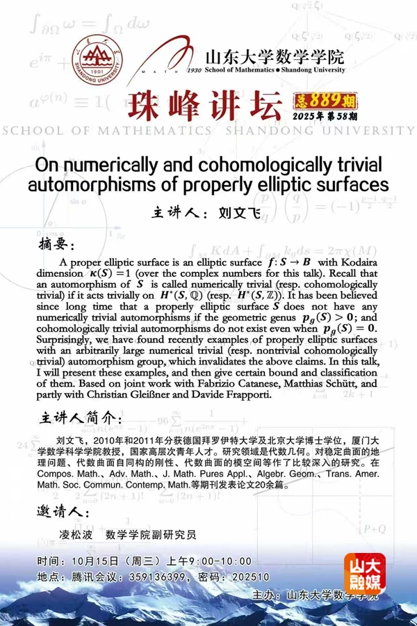 数学学院珠峰讲坛第889期:On numerically and cohomologically trivial automorphisms of properly elliptic surfaces