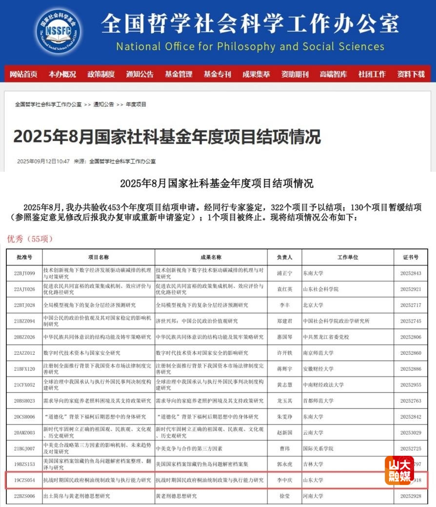 [本站讯]由山东大学历史学院副研究员李中庆主持的国家社科基金项目“抗战时期国民政府桐油统制政策与执行能力研究”(项目号:19CZS054),在2025年8月国家社科基金年度项目结项中获评“优秀”。该项目成果填补了国民政府桐油统制研究领域的关键空白,为深化近代中国经济政策史与抗战史研究提供了极具价值的学术参考。