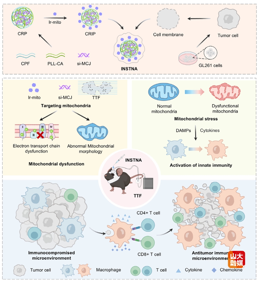 先天免疫在协调脑内免疫反应中发挥关键作用,然而,GBM已演化出逃逸机制以逃避免疫监视,给现有免疫治疗带来了重大挑战。基于此,研究团队开发了一种新型局部免疫治疗策略,旨在通过靶向诱导线粒体应激来重新激活GBM的先天免疫反应,从而增强肿瘤免疫原性。具体而言,研究团队构建了先天免疫激活纳米颗粒(INSTNA),其内包载有带正电的铱基复合物以及针对甲基化控制J蛋白的小干扰RNA,以削弱肿瘤细胞线粒体呼吸。INSTNA可有效破坏GBM细胞的线粒体功能,尤其在联合肿瘤电场治疗时效果更为显著。所设计的电荷翻转型INSTNA可抑制线粒体电子传递链,诱导氧化磷酸化应激,并导致线粒体基质内容物释放。此外,在术后GBM小鼠模型中,基于水凝胶的INSTNA给药方式可显著重塑免疫抑制性肿瘤微环境,从而诱导明显的肿瘤清除。研究结果表明在术后GBM中靶向诱导线粒体应激可增强先天免疫激活并提高适应性免疫应答,为缓解GBM复发提供了一条有前景的治疗途径。该研究成果近日发表于Advanced Materials,齐鲁医院神经外科倪石磊、张玉霖,湖南科技大学李毅为论文共同通讯作者;第一临床学院研究生韩旭、封帆、王梓旭为共同第一作者。