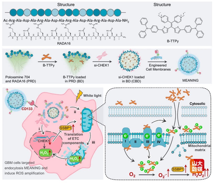 为克服GBM免疫原性低的特性,研究团队提出了一种通过原位操控线粒体电子传递链(ETC)激活内源性cGAS-STING信号通路,以增强GBM免疫应答的策略。在白光照射下,合成的蝴蝶状光敏剂B-TTPy通过产生过量活性氧破坏线粒体ETC。协同作用下,抑制检查点激酶 1(CHK1)可进一步加剧ETC功能障碍,从而增强B-TTPy对肿瘤细胞的细胞毒性。研究结果显示,自主开发的线粒体电子调控纳米颗粒(MEANING)可高效激活先天与适应性免疫反应,通过募集抗原递呈细胞和细胞毒性T细胞至术腔边缘,从而增强局部抗肿瘤免疫。此外,结合可降解水凝胶的术腔局部给药可重塑免疫抑制性肿瘤微环境并清除残余GBM细胞。综上所述,本研究开发了一种针对GBM的局部免疫激活策略,以预防术后复发,并揭示了ETC阻断作为低免疫原性肿瘤潜在治疗策略的应用前景。该研究成果近日发表于Nature Communications,齐鲁医院神经外科倪石磊、张玉霖,西北农林科技大学张艳荣为论文共同通讯作者;第一临床学院研究生房泽正、王军鹏,西北农林科技大学研究生程璐璐为共同第一作者。
